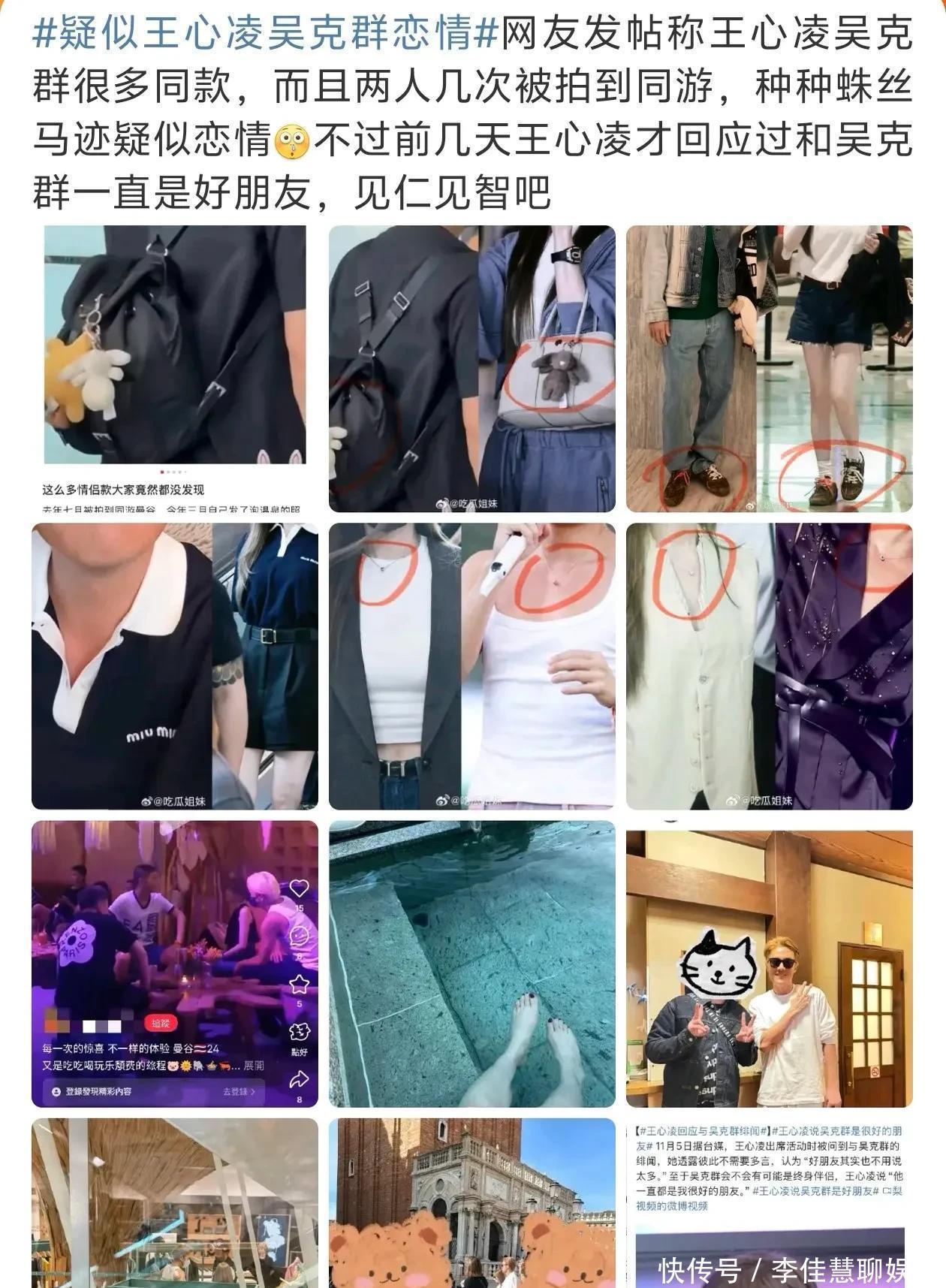 王心凌和吴克群如此频繁被拍到一起吃饭旅行,两人的关系绝对不是朋友那么简单。网友还扒出了两人有非常多一模一样的项链,戴一样的项链,穿一样的鞋子和短袖等情侣装,包包上的玩偶也是用一模一样的。绝对是热恋中吧。